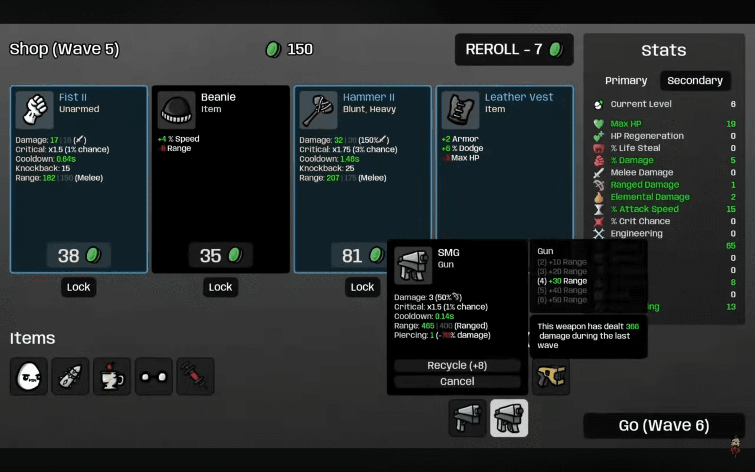 Brotato's between-wave shop creates strategic depth but harms the consistency of gameplay flow.