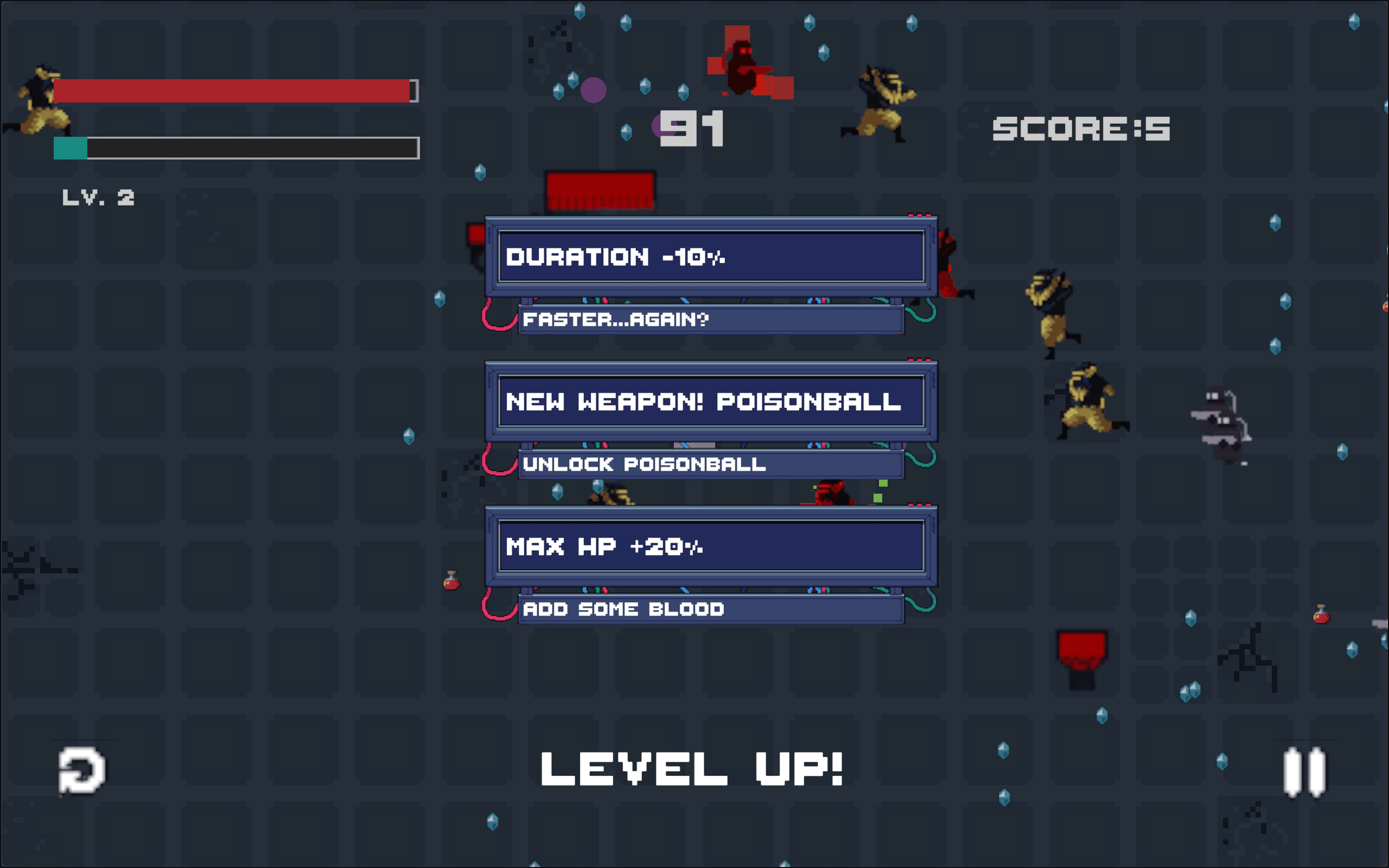 The shop interface interrupts the game's pace. The simultaneous appearance of six weapons might make it difficult for players to choose.