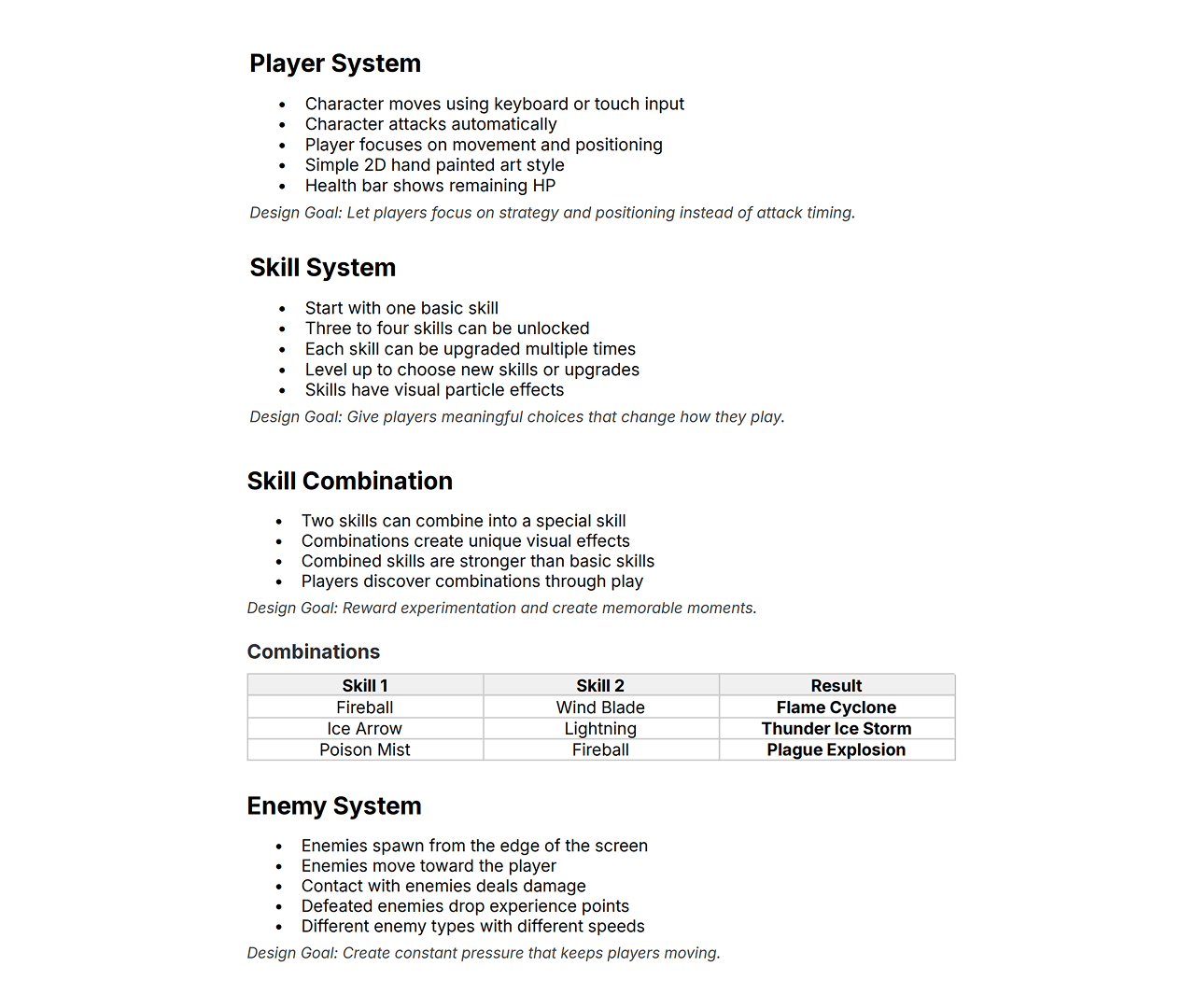 Due to limitations on the total game time, I designed the game to only retain the auto-attack function to improve convenience. Weapon combinations are limited to a few distinct variations (e.g., Fire + Frost = Lightning Ice Storm).
